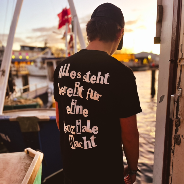 Dieses Shirt sagt alles – in kräftigen Lettern und mit klarer Haltung. Inspiriert vom Lyric der Single Asoziale Nacht bringt es den Sound und das Gefühl der Nacht direkt auf Stoff. Schwarzes Shirt, weißer Print, verzerrte Typo – für laute Abende und lange Nächte.